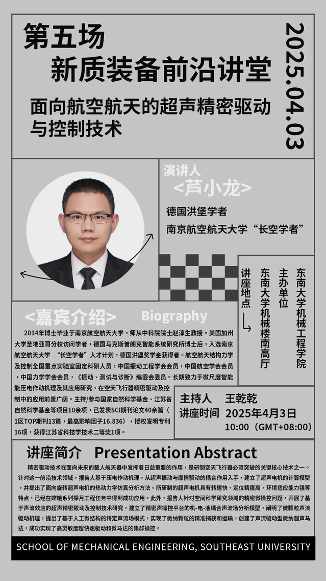 2025年机械学院“新质装备前沿讲堂”第五场:芦小龙教授——面向航空航天的超声精密驱动与控制技术