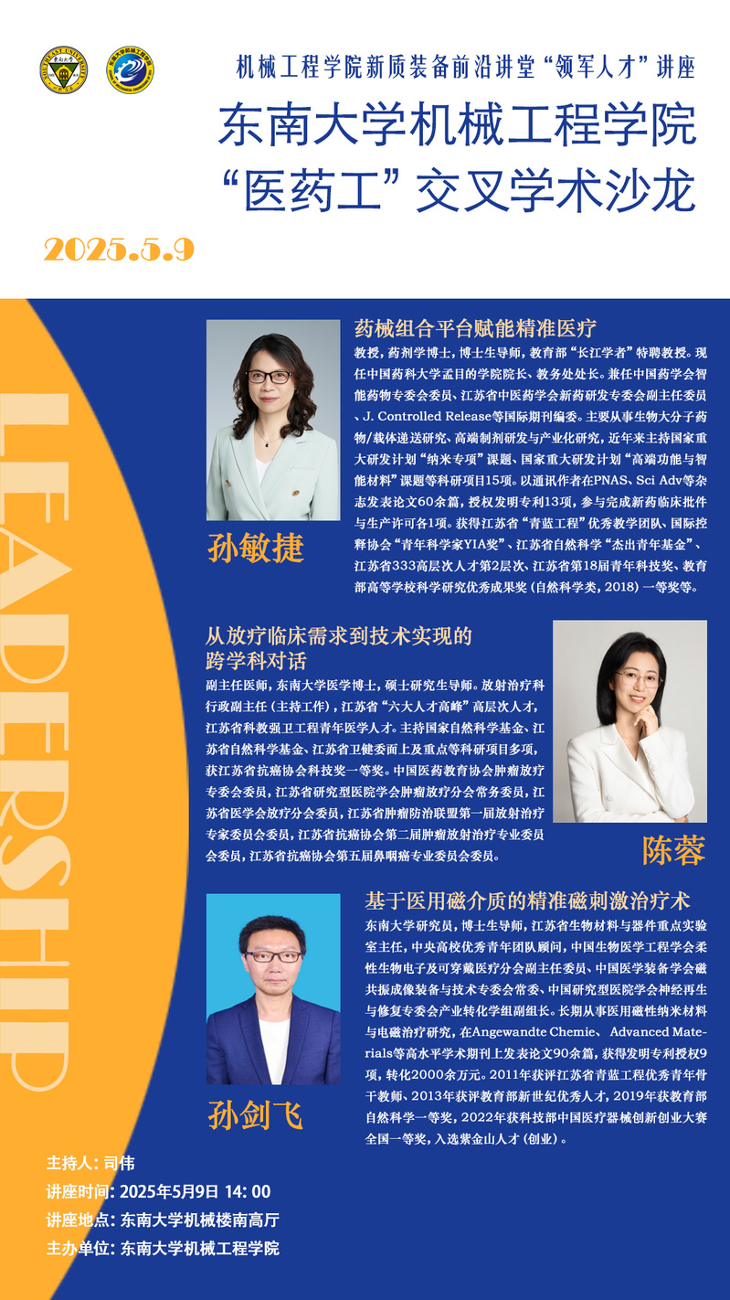 孙剑飞,东南大学研究员,博士生导师,江苏省生物材料与器件重点实验室主任,中央高校优秀青年团队顾问,中国生物医学工程学会柔性生物电子及可穿戴医疗分会副主任委员、中国医学装备学会磁共振成像装备与技术专委会常委、中国研究型医院学会神经再生与修复专委会产业转化学组副组长。长期从事医用磁性纳米材料与电磁治疗研究,在Angewandte Chemie、 Advanced Materials等高水平学术期刊上发表论文90余篇,获得发明专利授权9项,转化2000余万元。2011年获评江苏省青蓝工程优秀青年骨干教师、2013年获评教育部新世纪优秀人才,2019年获教育部自然科学一等奖,2022年获科技部中国医疗器械创新创业大赛全国一等奖,入选紫金山人才(创业)。