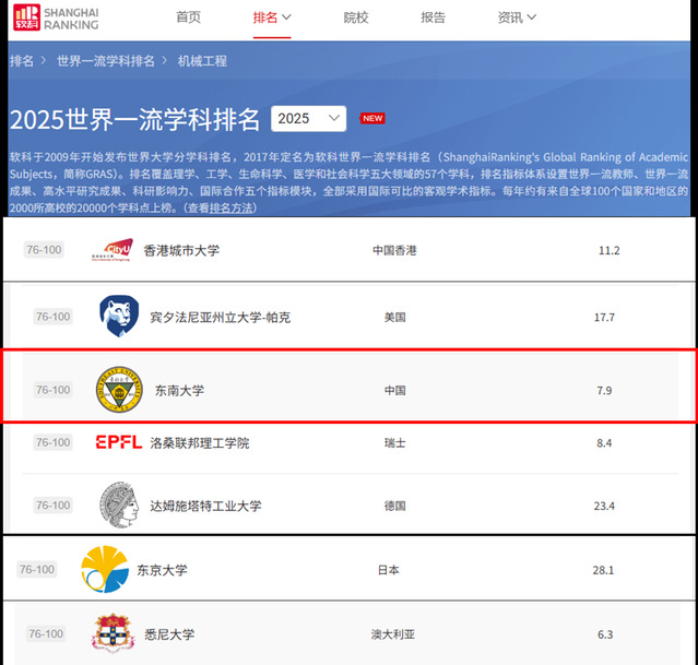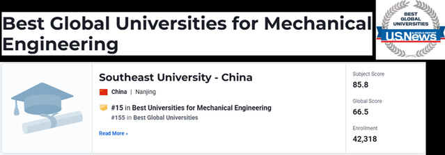 近日,东南大学机械工程学科在国际权威排名中实现重要突破:在2025年度US News全球最佳大学机械工程学科排名中位列第15,并在软科(ARWU)2025“世界一流学科排名”中跃居全球76-100区间。这标志着我院机械工程学科已稳步迈入全球一流学科阵营,与香港城市大学、东京大学、悉尼大学、洛桑联邦理工学院等世界一流高校的机械工程学科位列同一梯队。