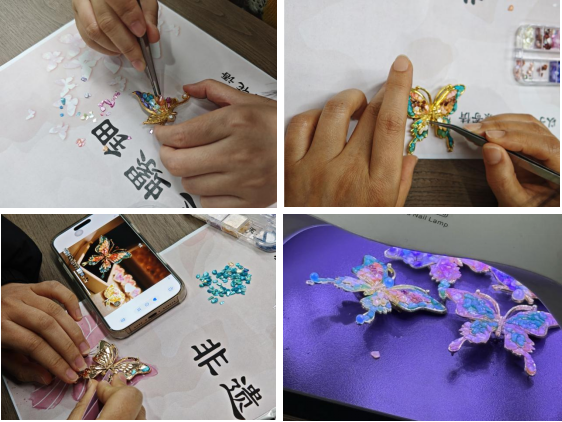 螺钿起源于商代,是一种最常见的传统装饰艺术,被广泛应用于漆器、家具、乐器、屏风、盒匣、盆碟、木雕以及有关的工艺品上,现代被越来越多地运用在文创产品上,是中国特有的传统艺术瑰宝。学院邀请了师从国内著名花艺师曹雪老师的季红女士现场进行讲解。教职工们纷纷化身“手工匠人”,亲身投入到螺钿胸针的制作中。从选料到涂胶,再到巧妙镶嵌螺钿片,老师们时而安静投入专注细腻操作,时而会心一笑交流制作心得,时而相互欣赏分享创意灵感,一件件独具匠心的螺钿胸针在老师们手中逐渐诞生,一股股友爱互助的温情暖意在老师们心间悄悄传递。