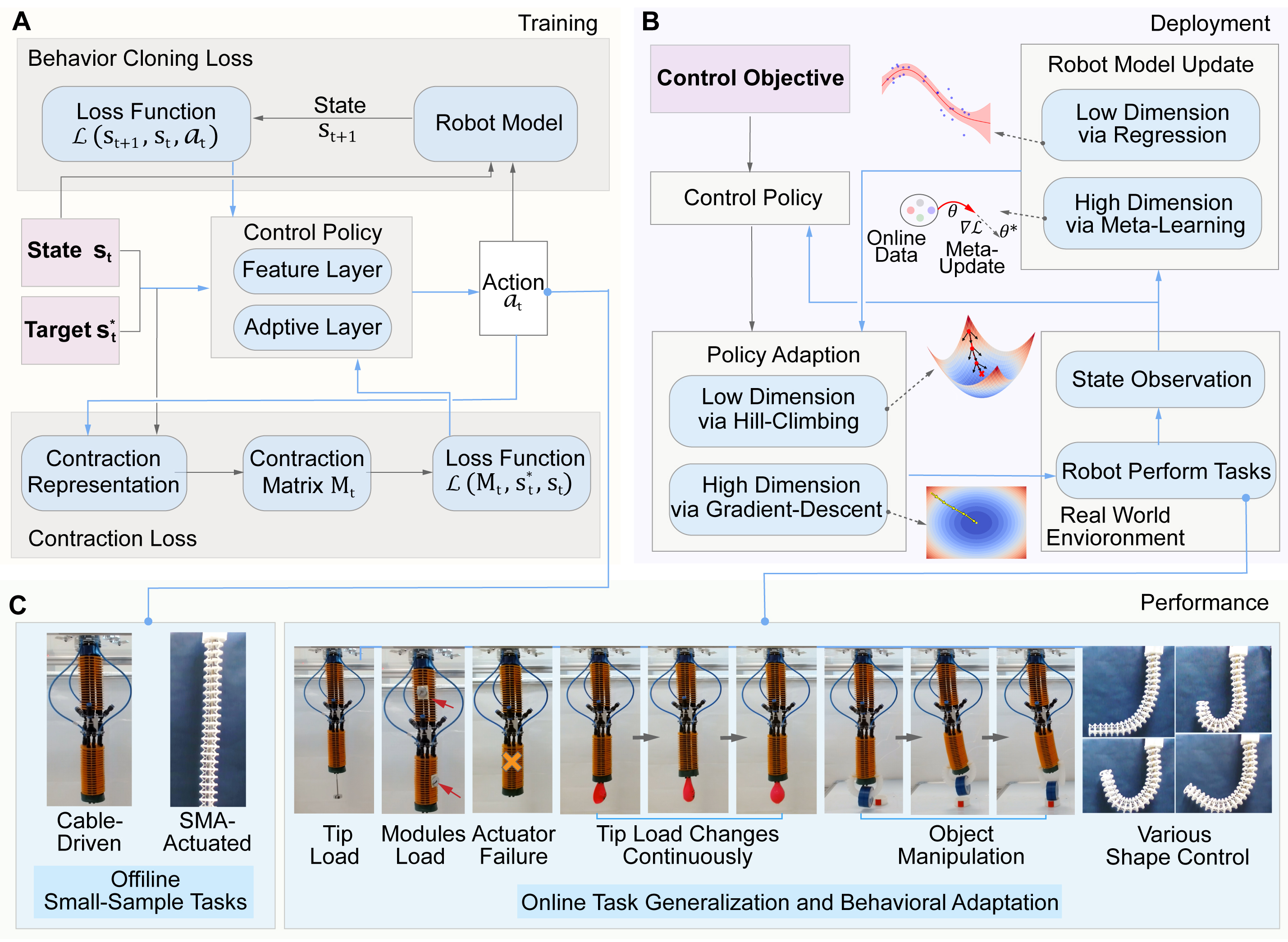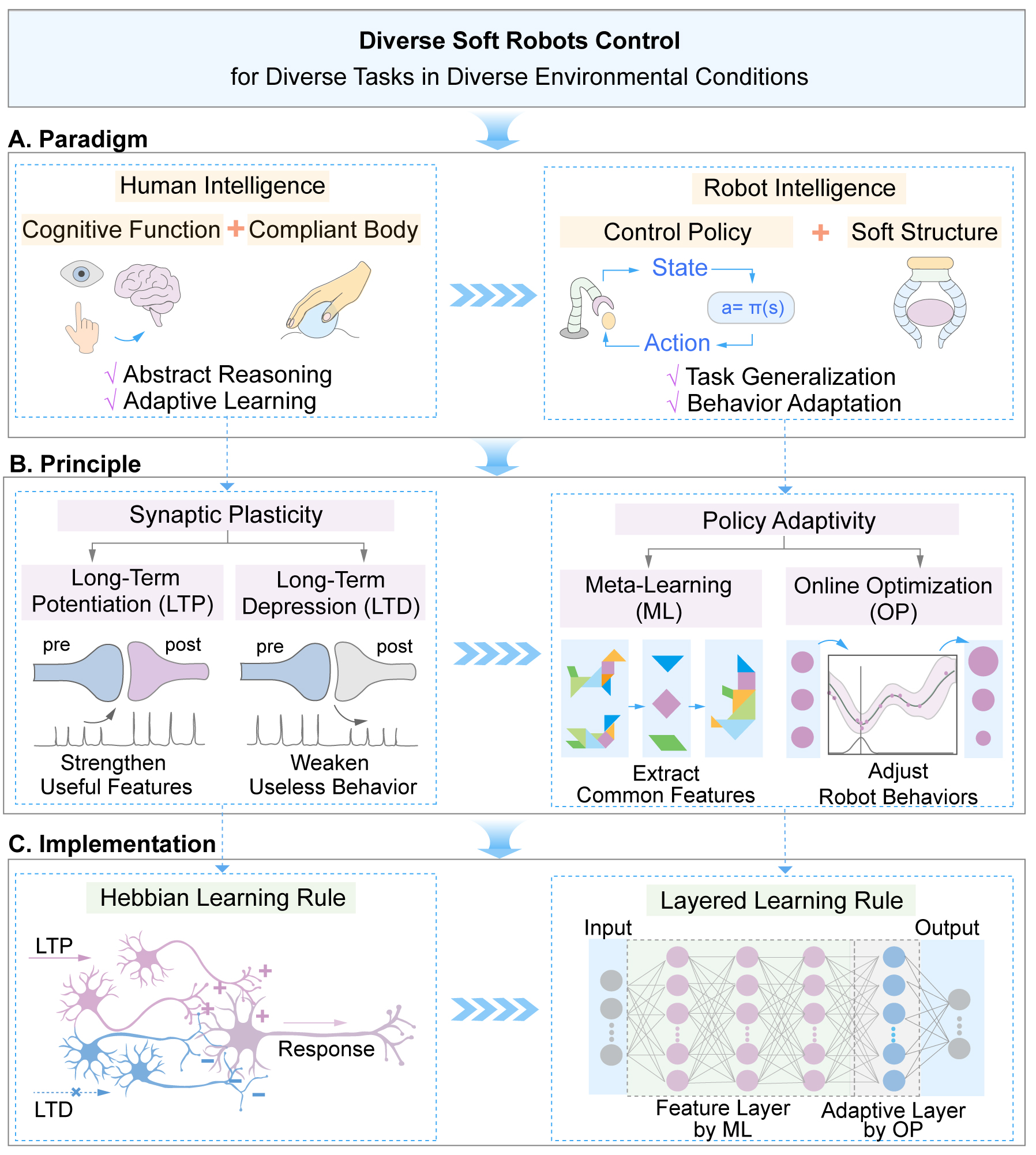 近日,我院唐志强、王乾乾教授团队联合新加坡国立大学Cecilia Laschi教授与麻省理工学院Daniela Rus教授团队在国际顶级综合性学术期刊Science Advances发表题为“A general soft robotic controller inspired by neuronal structural and plastic synapses that adapts to diverse arms, tasks, and perturbations”的研究论文,提出了一种面向软体机器人的通用学习与控制框架,在多任务执行、复杂环境适应以及跨平台泛化方面取得重要进展(图1)。