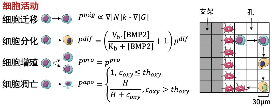 通过对免疫细胞、干细胞等在细胞因子环境下迁移、增殖、分化、凋亡行为的数学定义预测骨器械植入后的骨组织再生、多细胞自组织行为,在此基础上通过设计骨植入器械结构调节微环境,促进植入器械的骨整合。